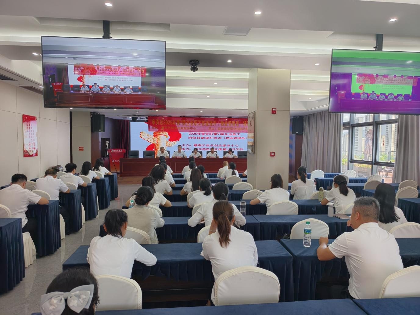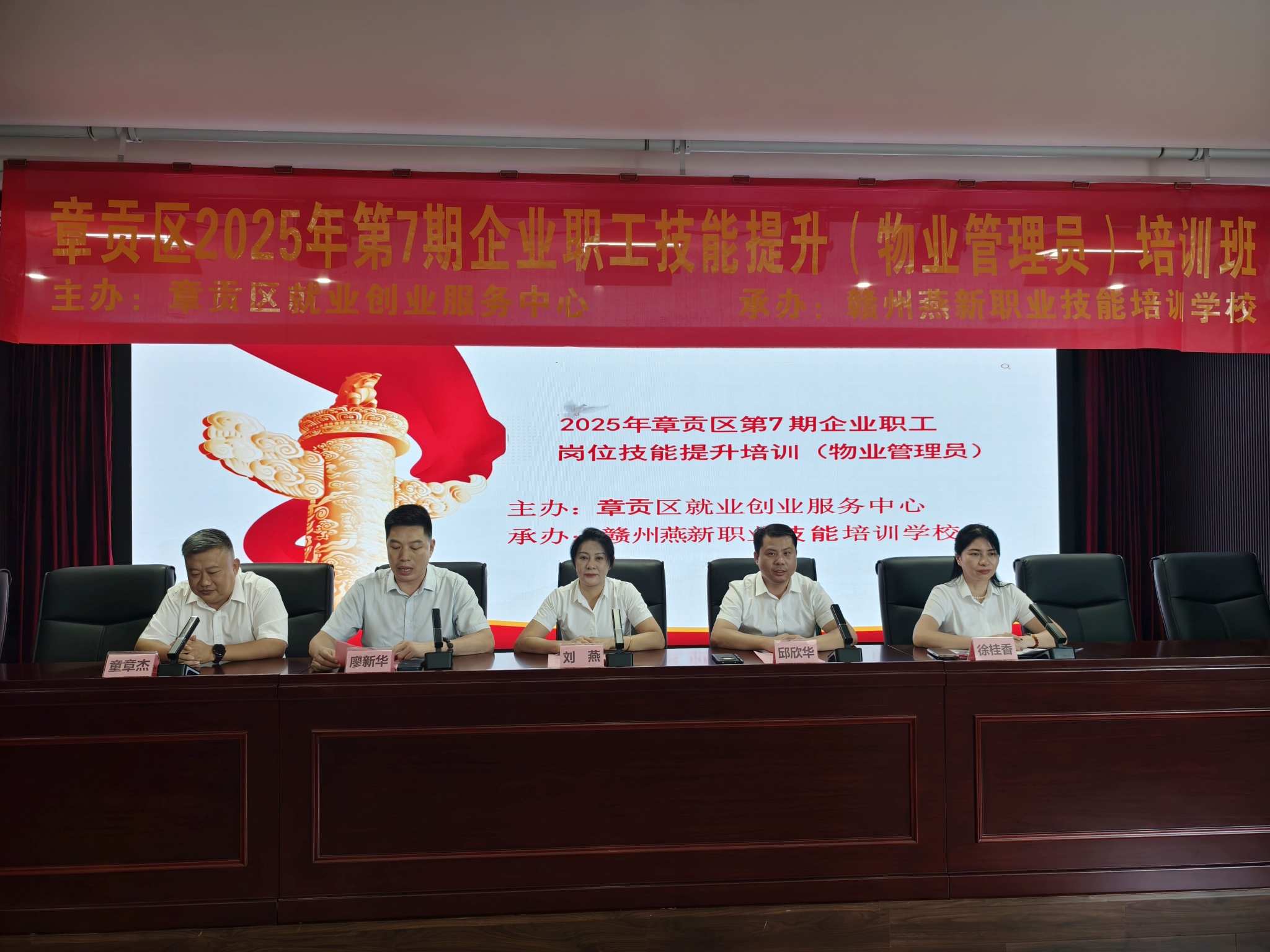 8 月 8 日下午,江西燕兴物业管理集团有限公司第一期物业管理员企业在岗职工技能提升培训开班仪式顺利举行。本次培训由章贡区就业创业服务中心主办、赣州燕新职业技能培训学校承办,旨在全面提升物业管理人员的专业素养与实操能力,助力物业行业高质量发展。江西燕兴物业管理集团有限公司党委书记、董事长刘燕,赣州燕新职业技能培训学校校长邱欣华,培训班主要负责人廖新华会长、江西燕兴物业管理集团有限公司常务副总经理徐桂香、副总经理童章杰出席开班仪式。